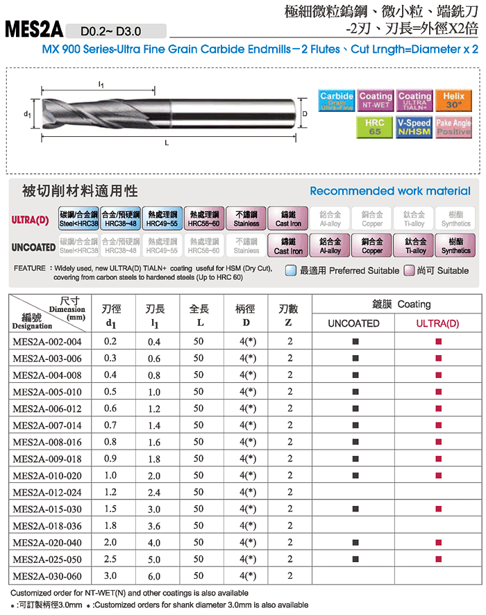 Name:MX 900 Series-Ultra Fine Grain Carbide Endmills-2 Flutes、Cut Lrngth=Diameter x 2