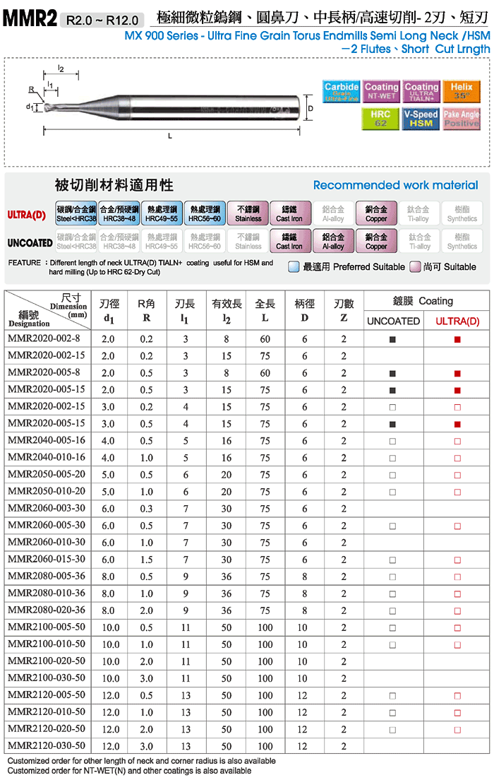 > MX 900 Series-Ultra Fine Grain Carbide Torus Endmills Semi Long Neck /HSM 2 Flutes ¡B Short Cut Lrng