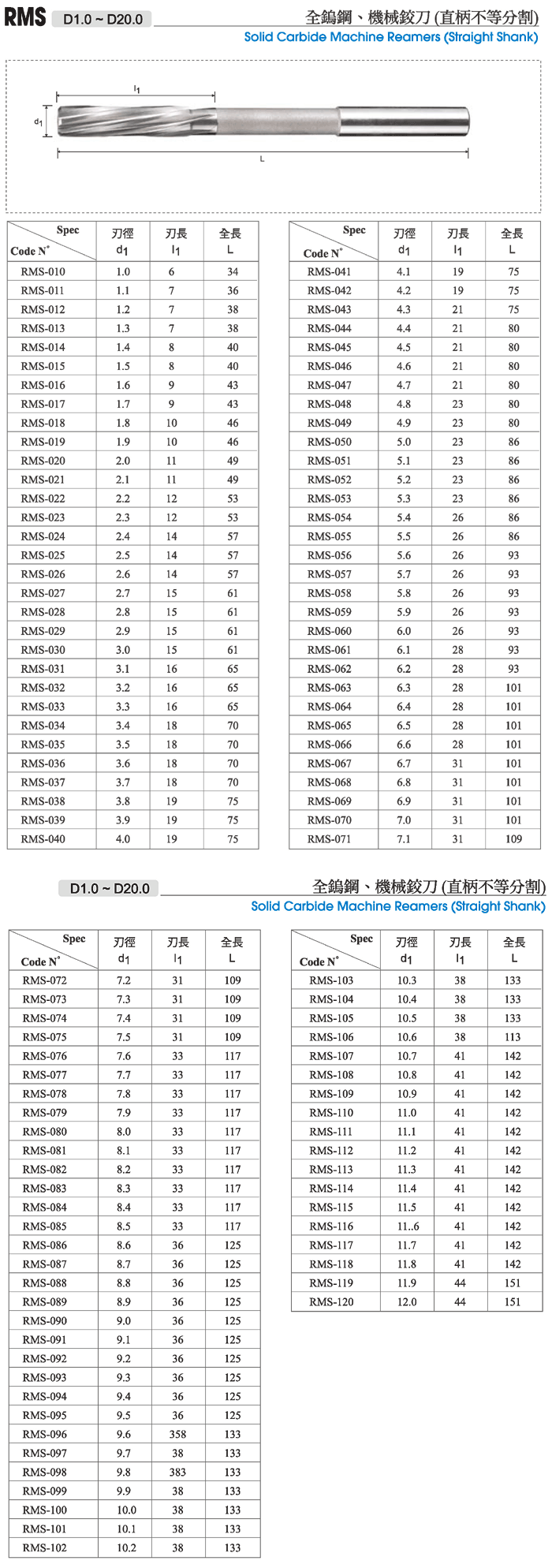 Solid Carbide Machine Reamers (Straight Shank) / RMS Size:D1.0~D20.0