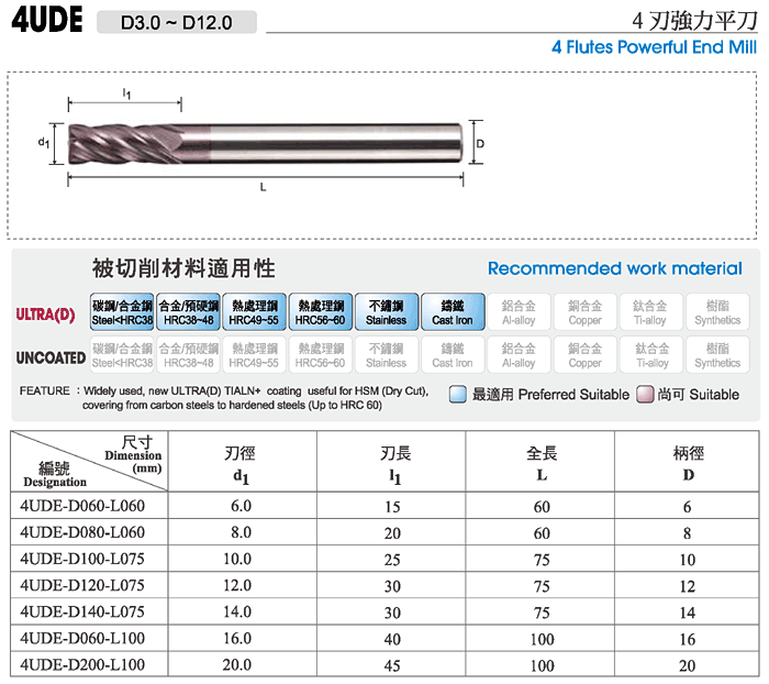 4 Flutes Powerful End Mill / 4UDE Size:D3.0~D12.0